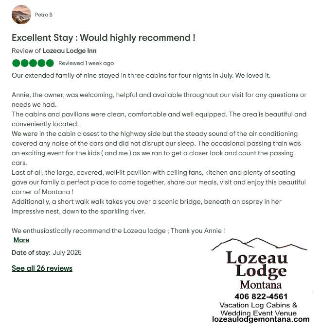 Created for overnight travelers and extended-stay guests, LOZEAU (Lozo) LODGE rents beautiful Montana vacation log cabins with all the amenities of first-class lodging set in a modern rustic style. Our covered Event Pavilion is popular for weddings / events.